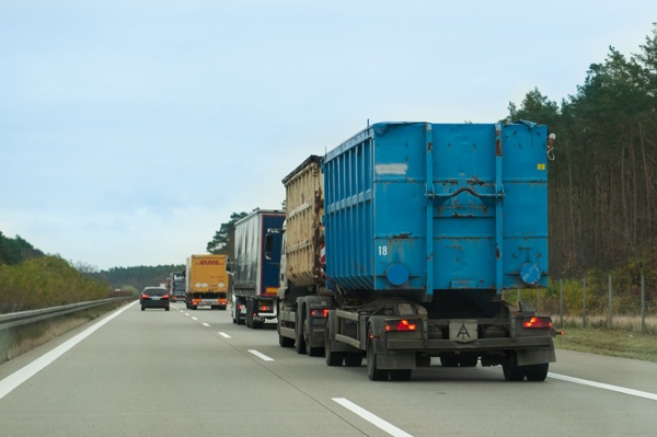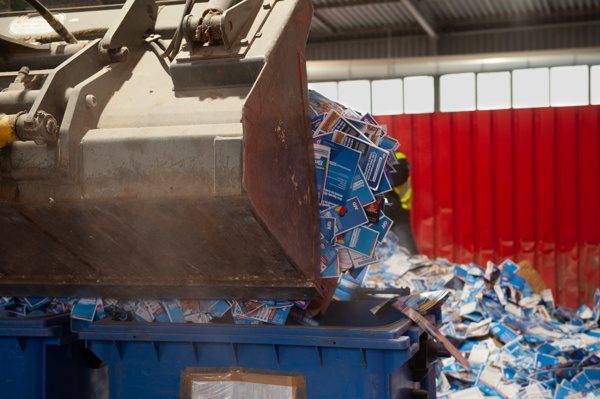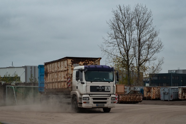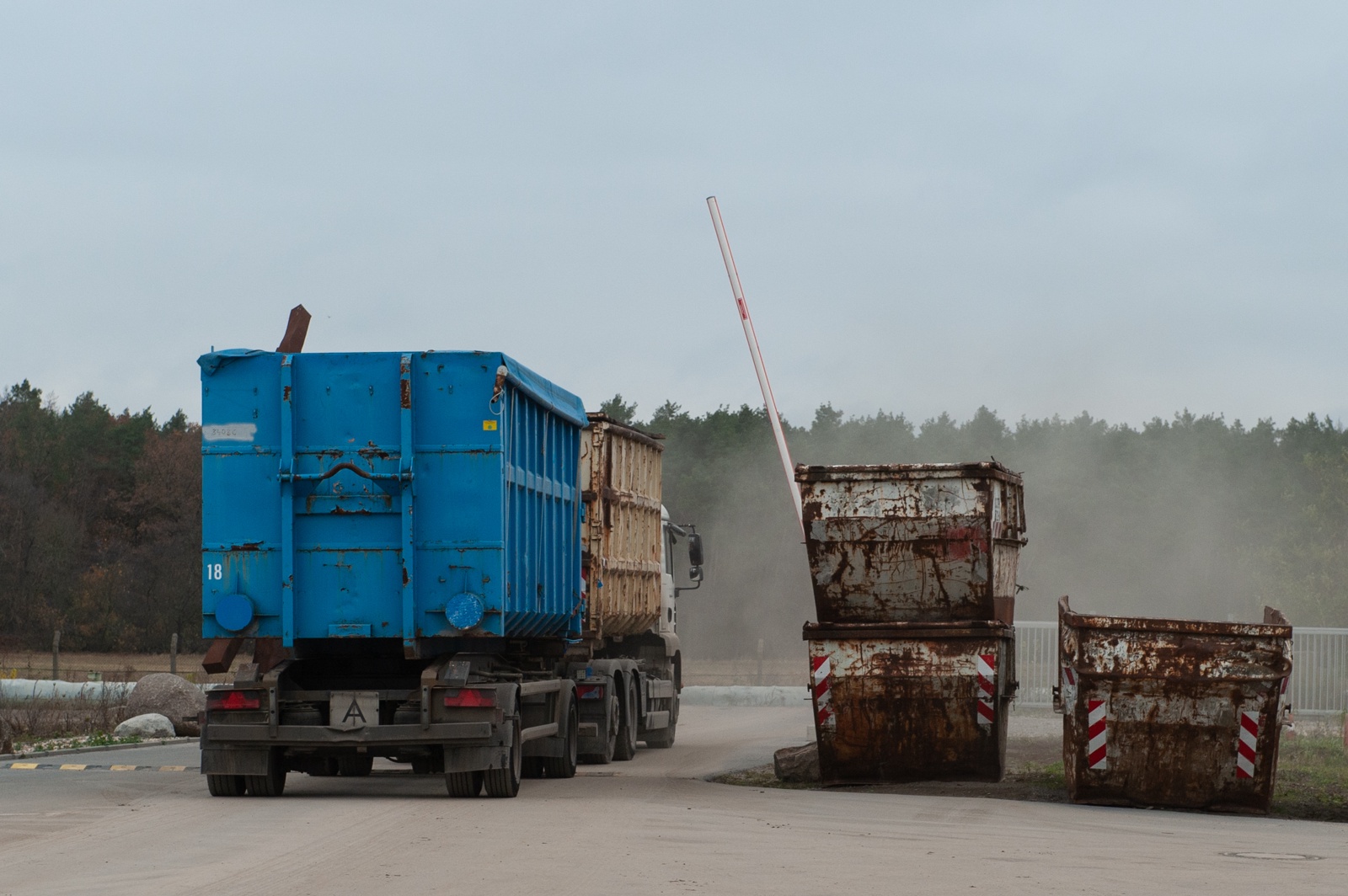 Afterwards, they are picked up with a front loader and stuffed into a typical blue 1.1m³ trash container.