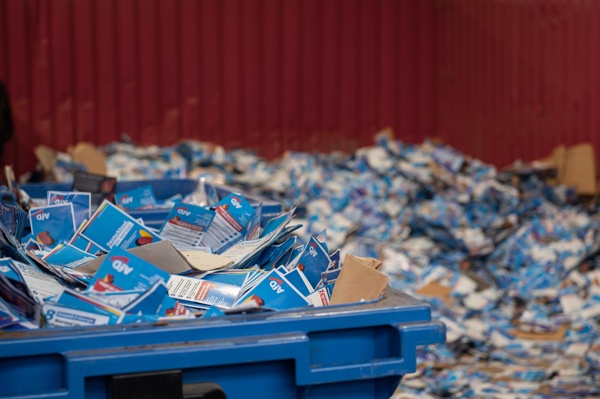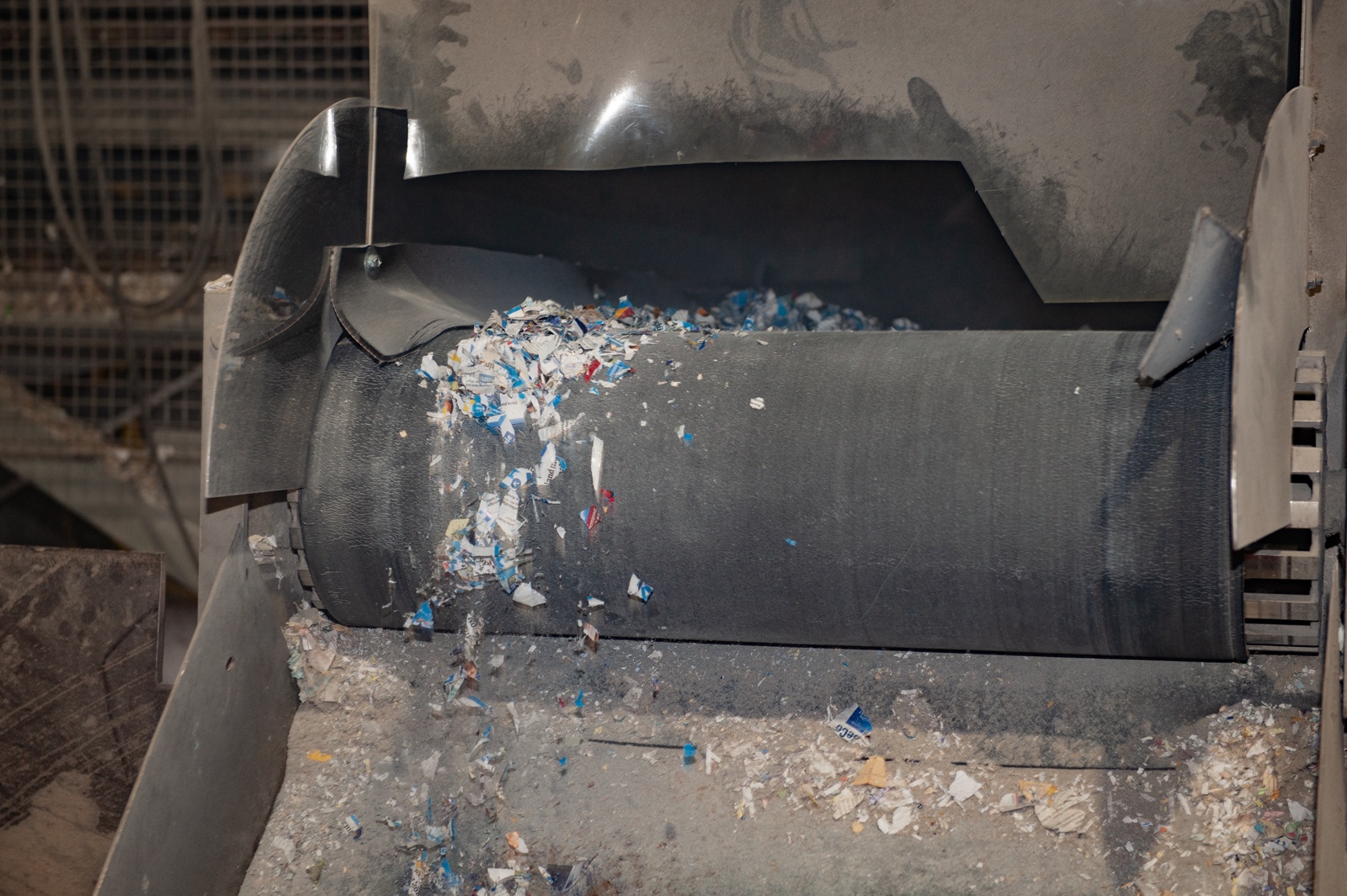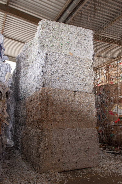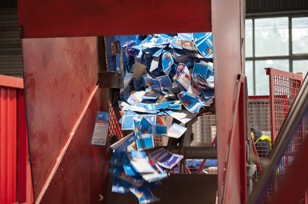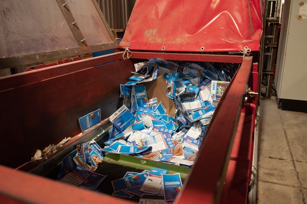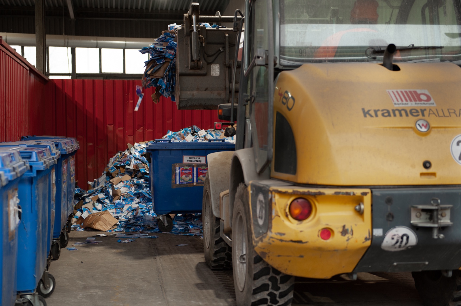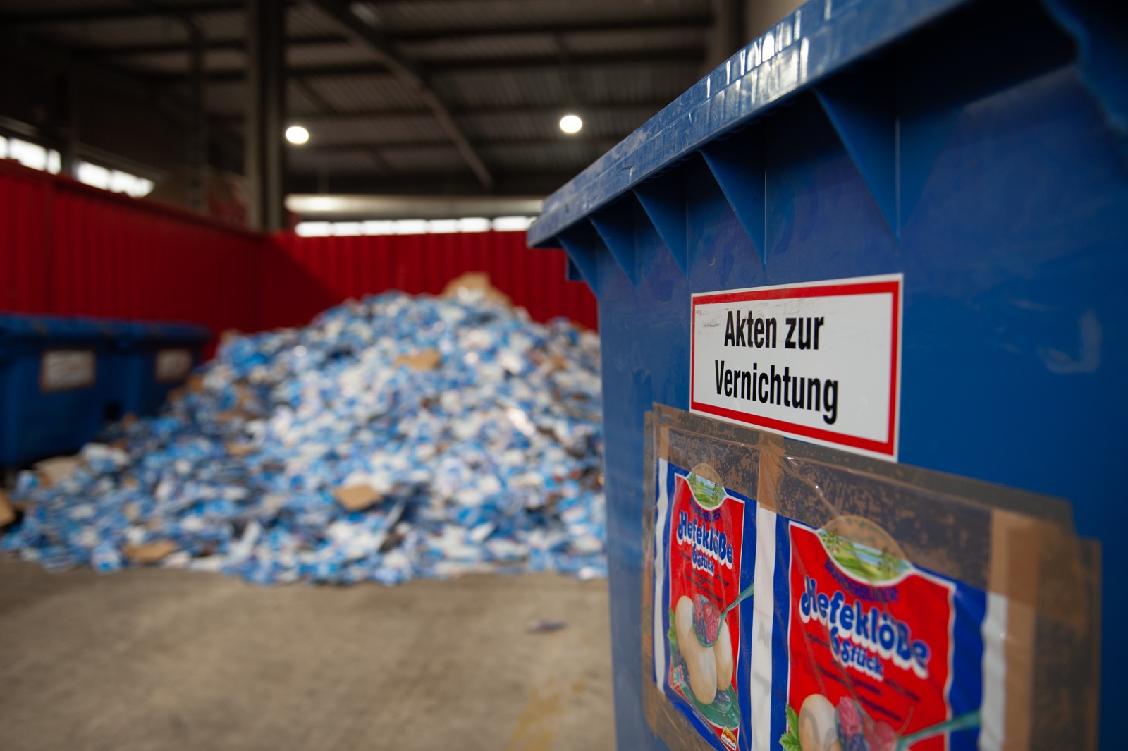 From the 1.1m³ containers, they are dumped into the shredding machine and afterwards compacted into blocks like the one shown in last picture. Those blocks get recycled in a paper plant and will most likely end up in recycling toilet paper or paper towels.